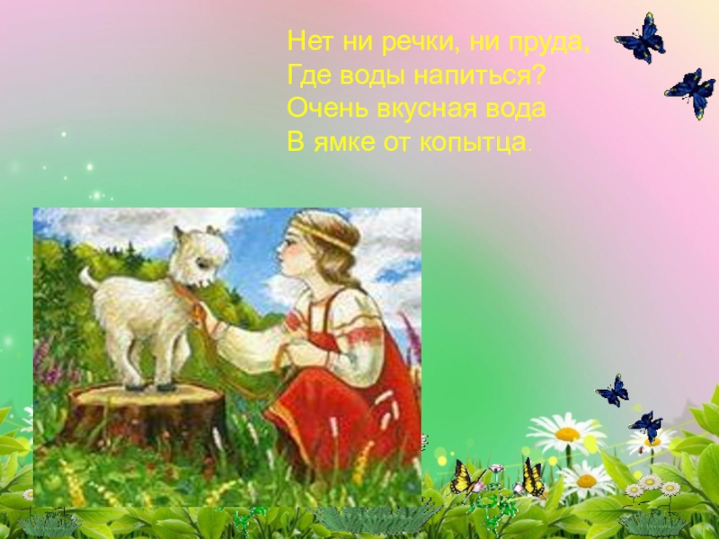 Нет ни речки, ни пруда,Где воды напиться?Очень вкусная водаВ ямке от копытца.