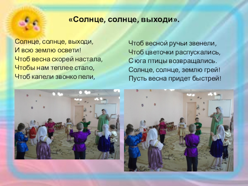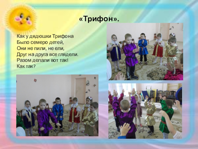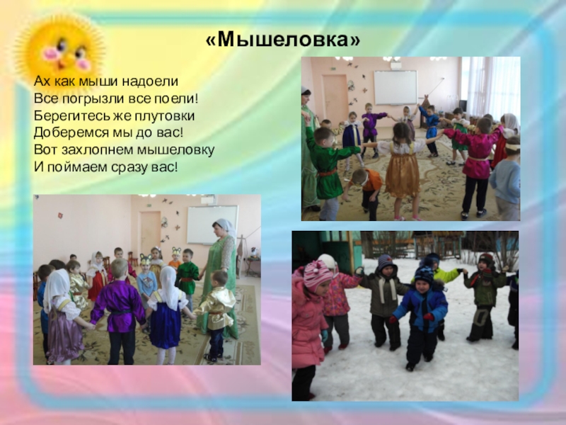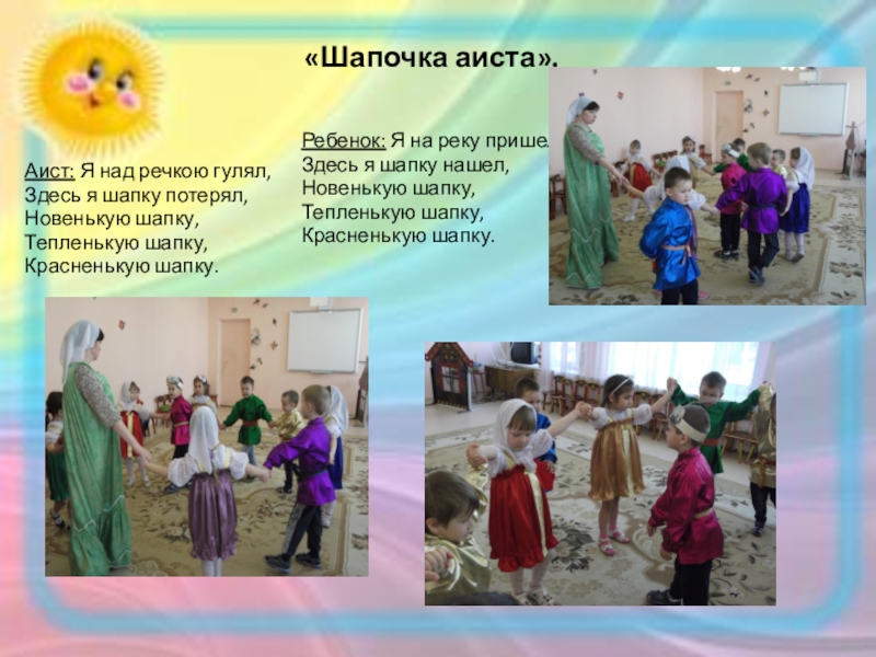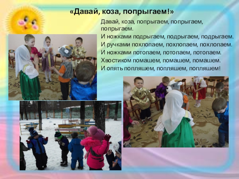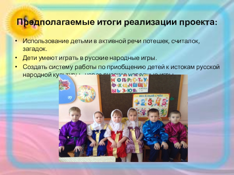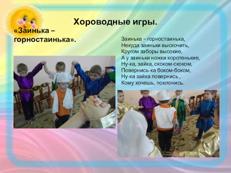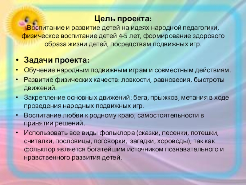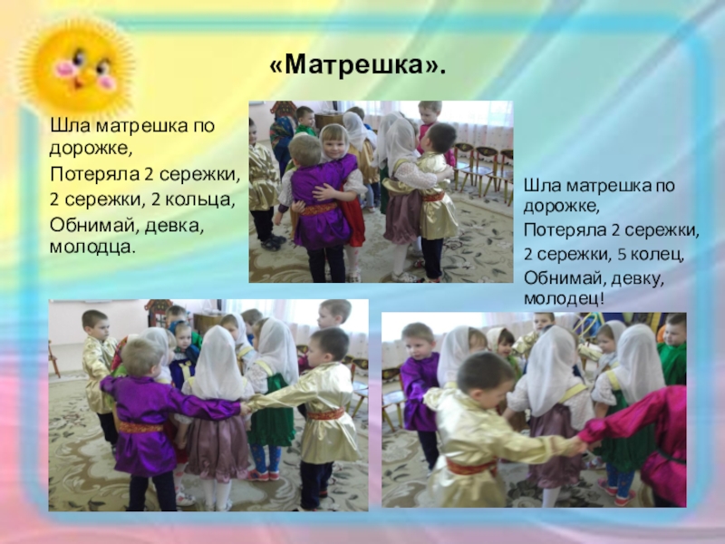 Использовать все виды фольклора (сказки, песенки, потешки, считалки, пословицы, поговорки, загадки, хороводы), так как фольклор является богатейшим источником познавательного и нравственного развития детей.