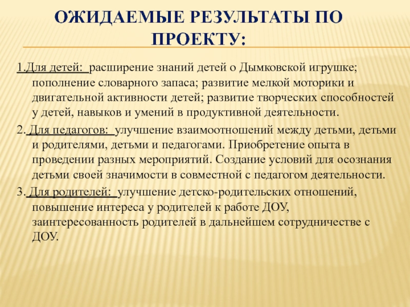 1.Для детей: расширение знаний детей о Дымковской игрушке;