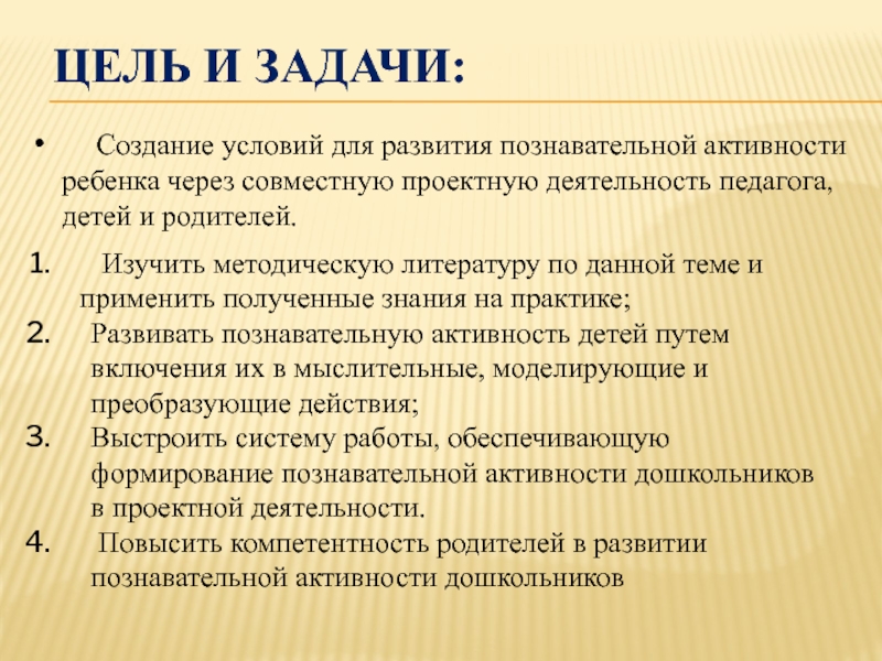 Выстроить систему работы, обеспечивающую формирование познавательной активности дошкольников в проектной деятельности.