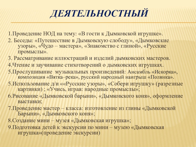 1.Проведение НОД на тему: «В гости к Дымковской игрушке».