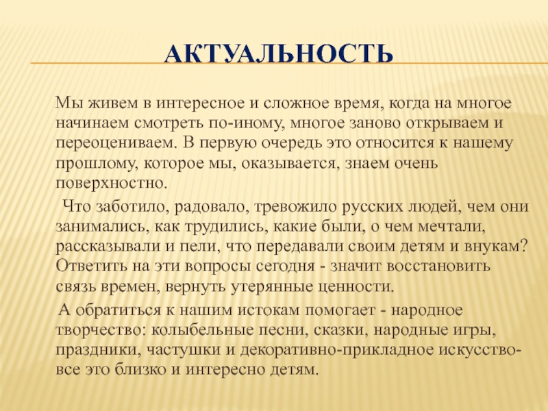 А обратиться к нашим истокам помогает - народное творчество: колыбельные песни, сказки, народные игры, праздники, частушки и декоративно-прикладное искусство- все это близко и интересно детям.
