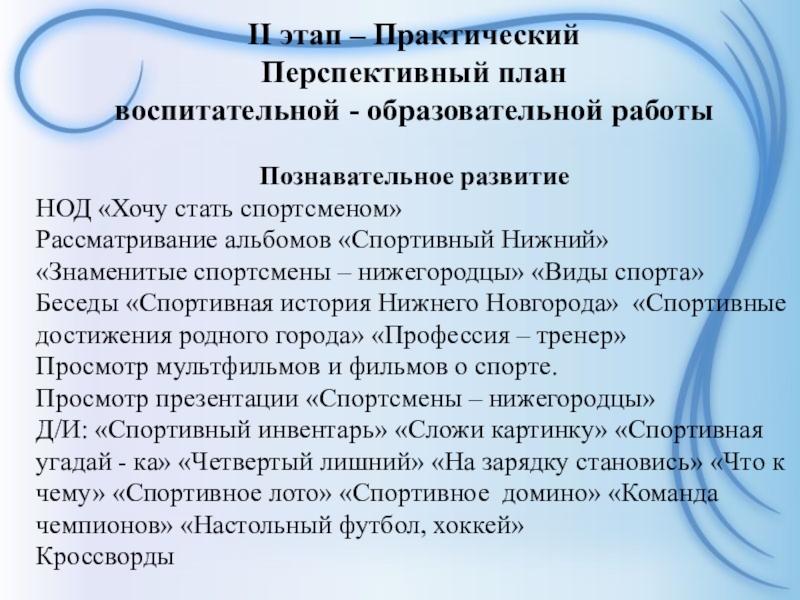 - Расширять и обогащать представления детей о спортивных объектах Нижнего Новгорода, видах спорта, спортсменах.