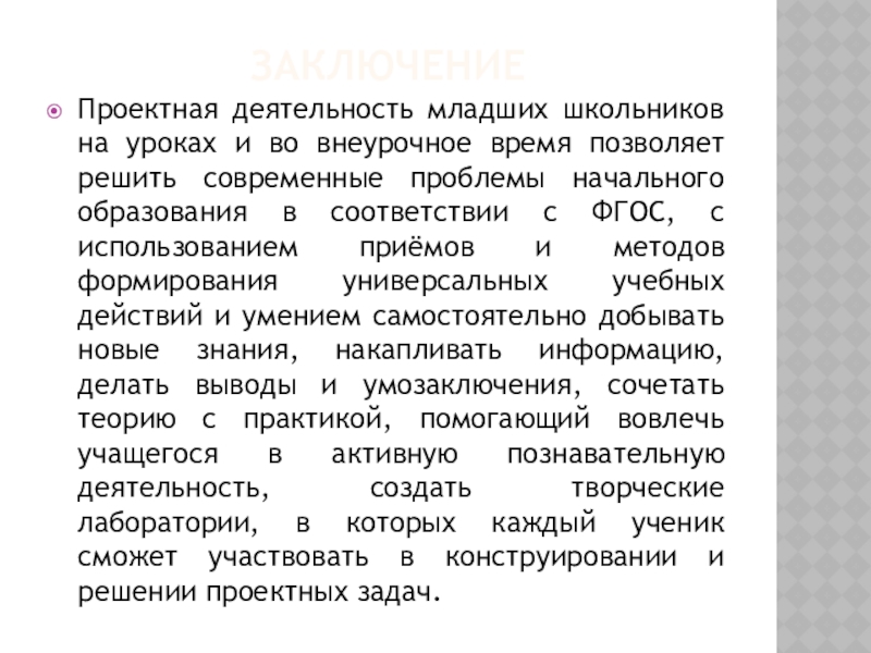 ЗАКЛЮЧЕНИЕ Проектная деятельность младших школьников на уроках и во внеурочное время позволяет решить современные проблемы начального образования
