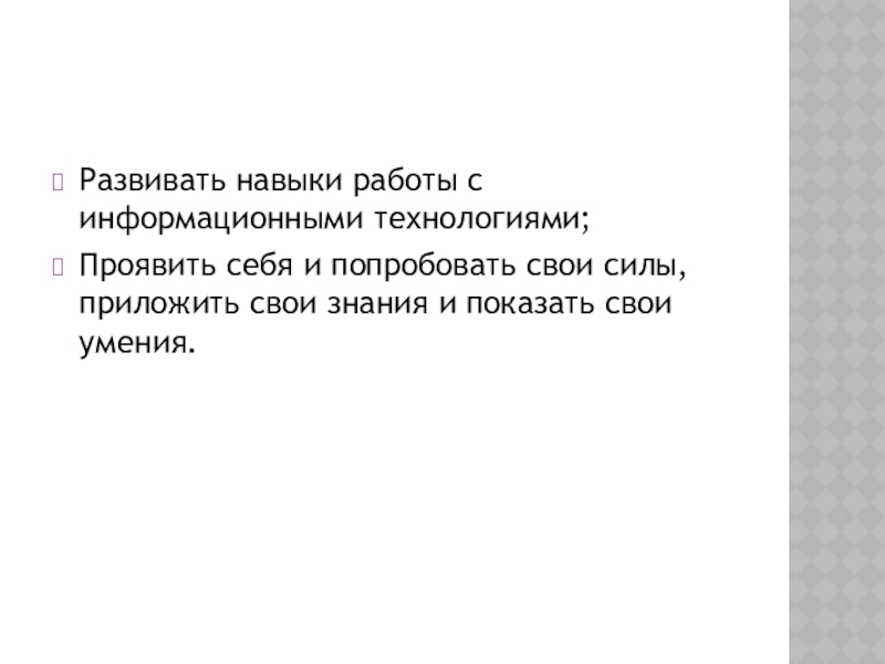 Развивать навыки работы с информационными технологиями;Проявить себя и попробовать свои силы, приложить свои знания и показать свои