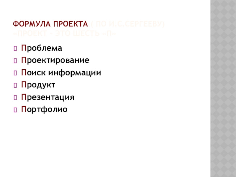 Слайд 3Формула проекта ( по И.С.Сергееву) «Проект – это шесть «П»