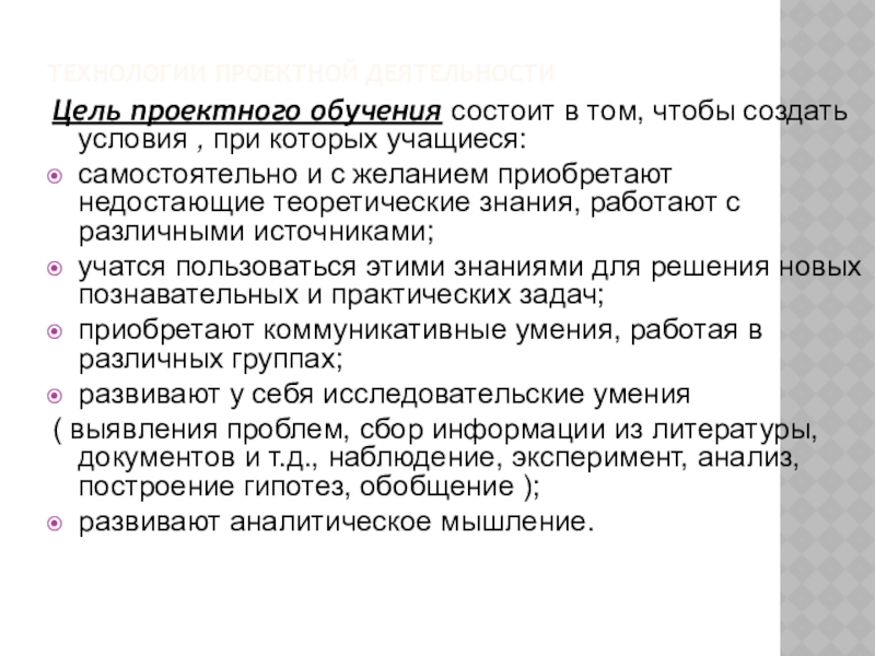 Технологии проектной деятельностиЦель проектного обучения состоит в том, чтобы создать условия , при которых учащиеся:самостоятельно и с