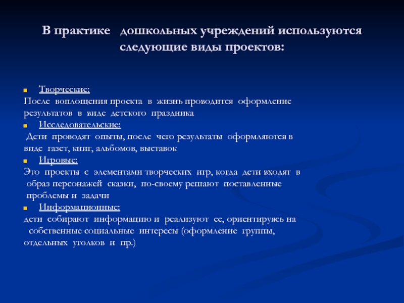 Слайд 6В практике дошкольных учреждений используются следующие виды проектов: