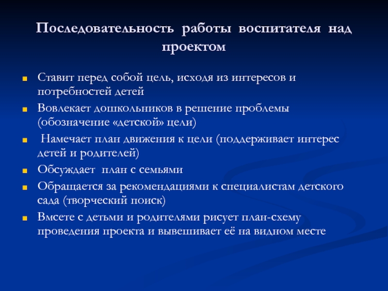 Слайд 13Последовательность работы воспитателя над проектом