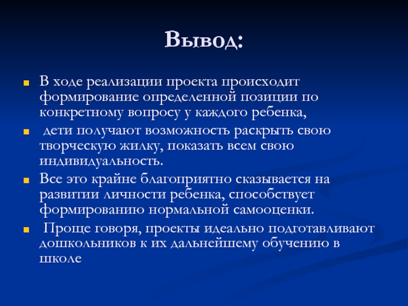 ребенком окружающей среды в процессе поэтапной и заранее спланированной практической деятельности по достижению намеченных целей. «Проект создает то, чего еще нет; он требует всегда иного качества или показывает путь к его получению».
