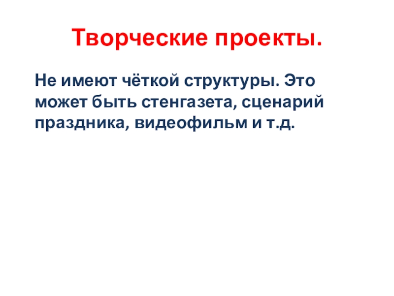 Творческие проекты.Не имеют чёткой структуры. Это может быть стенгазета, сценарий праздника, видеофильм и т.д.
