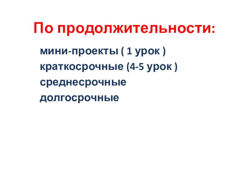 По продолжительности:мини-проекты ( 1 урок )краткосрочные (4-5 урок )среднесрочныедолгосрочные