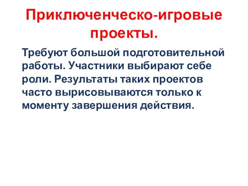 Приключенческо-игровые проекты.Требуют большой подготовительной работы. Участники выбирают себе роли. Результаты таких проектов часто вырисовываются только к моменту