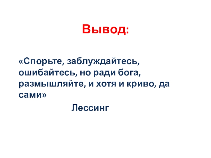 Вывод:«Спорьте, заблуждайтесь, ошибайтесь, но ради бога, размышляйте, и хотя и криво, да сами»