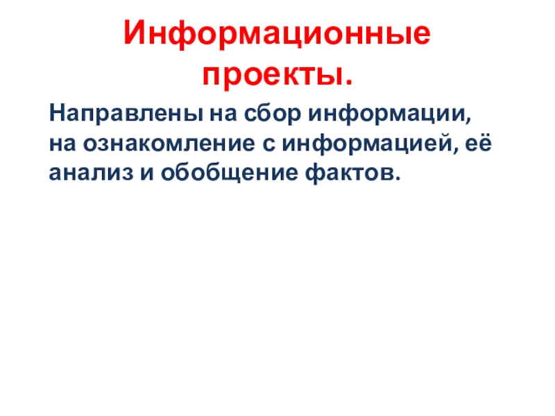 Информационные проекты.Направлены на сбор информации, на ознакомление с информацией, её анализ и обобщение фактов.