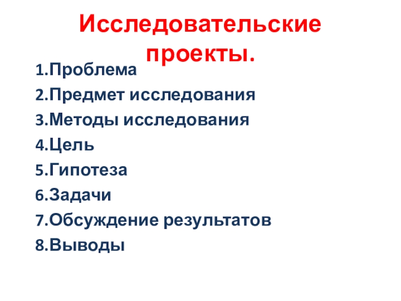 Исследовательские проекты.1.Проблема2.Предмет исследования3.Методы исследования4.Цель5.Гипотеза6.Задачи7.Обсуждение результатов8.Выводы