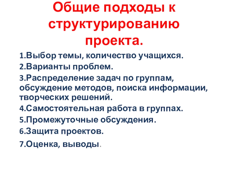 Общие подходы к структурированию проекта.1.Выбор темы, количество учащихся.2.Варианты проблем.3.Распределение задач по группам, обсуждение методов, поиска информации, творческих