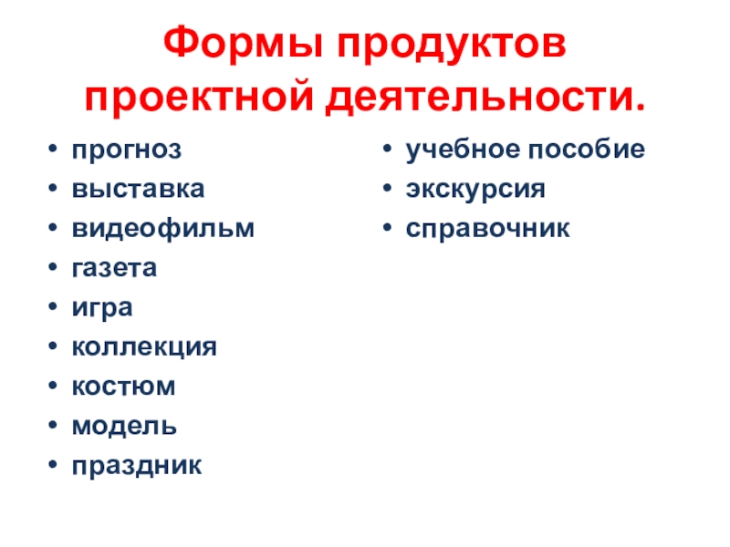 Формы продуктов проектной деятельности.прогнозвыставкавидеофильмгазетаиграколлекциякостюммодельпраздникучебное пособиеэкскурсиясправочник