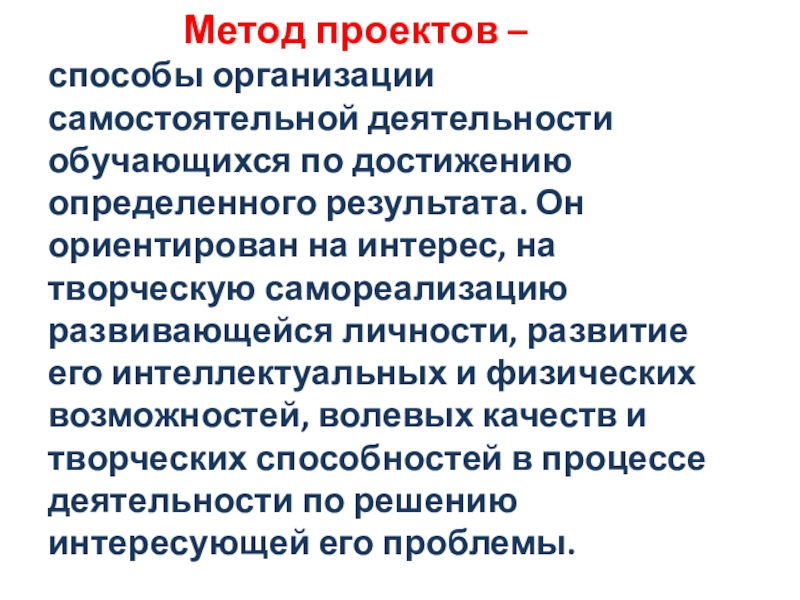 способы организации самостоятельной деятельности обучающихся по достижению определенного результата. Он ориентирован на интерес, на творческую самореализацию развивающейся личности, развитие его интеллектуальных и физических возможностей, волевых качеств и творческих способностей в процессе деятельности по решению интересующей его проблемы.