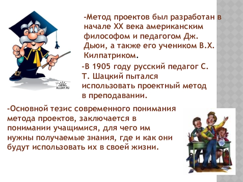 -В 1905 году русский педагог С.Т. Шацкий пытался использовать проектный метод в преподавании.