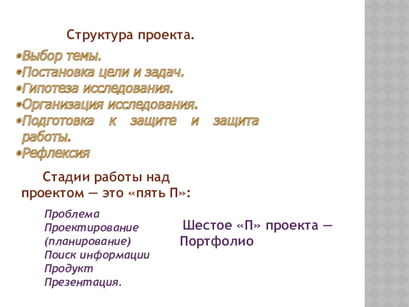 Проблема Проектирование (планирование) Поиск информации Продукт Презентация.