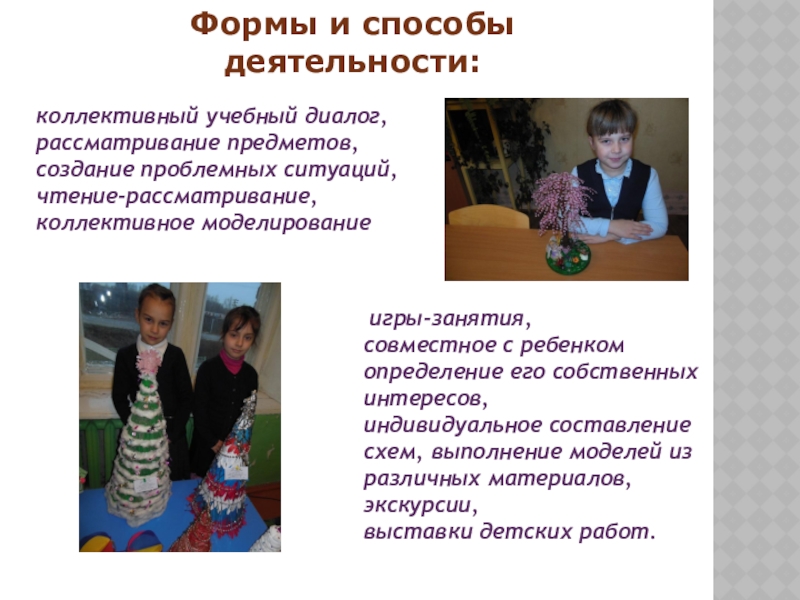 игры-занятия, совместное с ребенком определение его собственных интересов, индивидуальное составление схем, выполнение моделей из различных материалов, экскурсии, выставки детских работ.