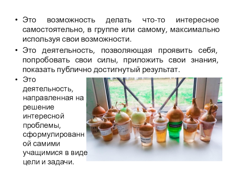Это деятельность, направленная на решение интересной проблемы, сформулированной самими учащимися в виде цели и задачи.