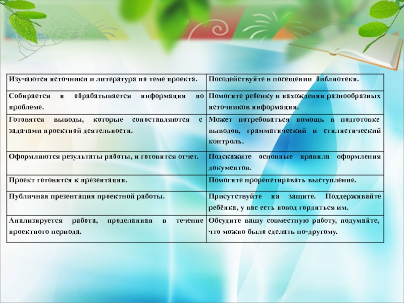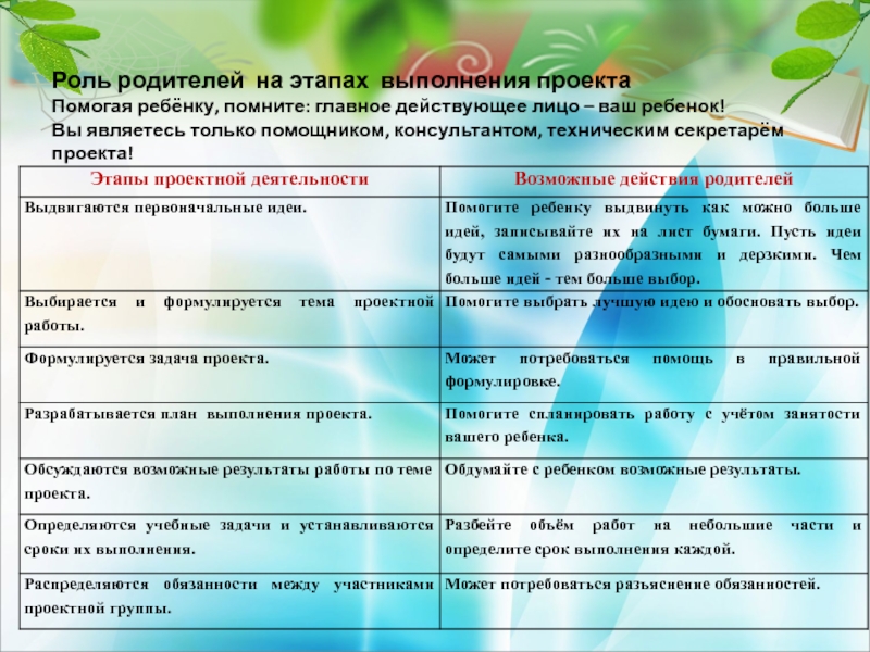 Слайд 37Роль родителей на этапах выполнения проекта