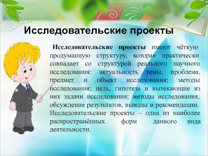 практически совпадает со структурой реального научного исследования: актуальность темы, проблема, предмет и объект исследования; методы исследования; цель, гипотеза и вытекающие из них задачи исследования; методы исследования, обсуждение результатов, выводы и рекомендации. Исследовательские проекты – одна из наиболее распространённых форм данного вида деятельности.