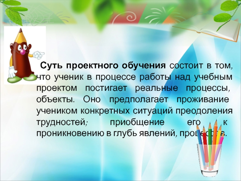 Слайд 4 Суть проектного обучения состоит в том, что ученик в