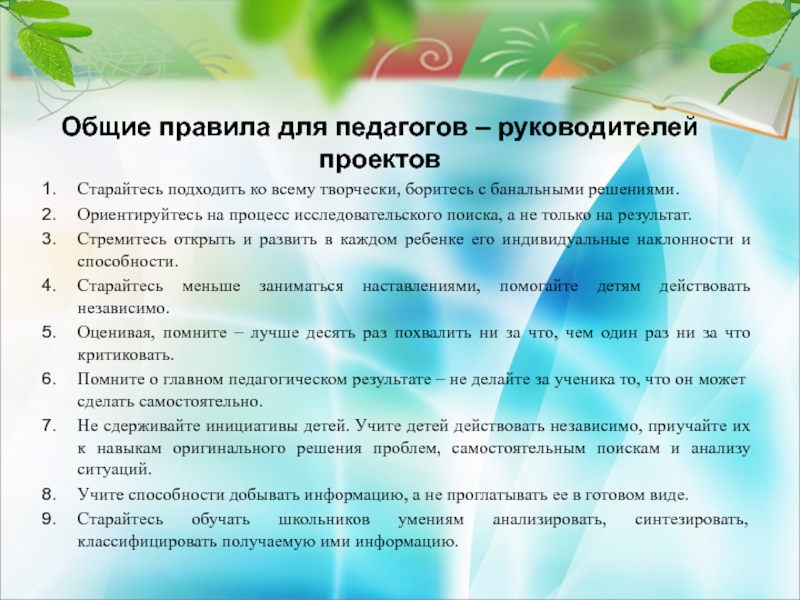 Слайд 31Общие правила для педагогов – руководителей проектов
