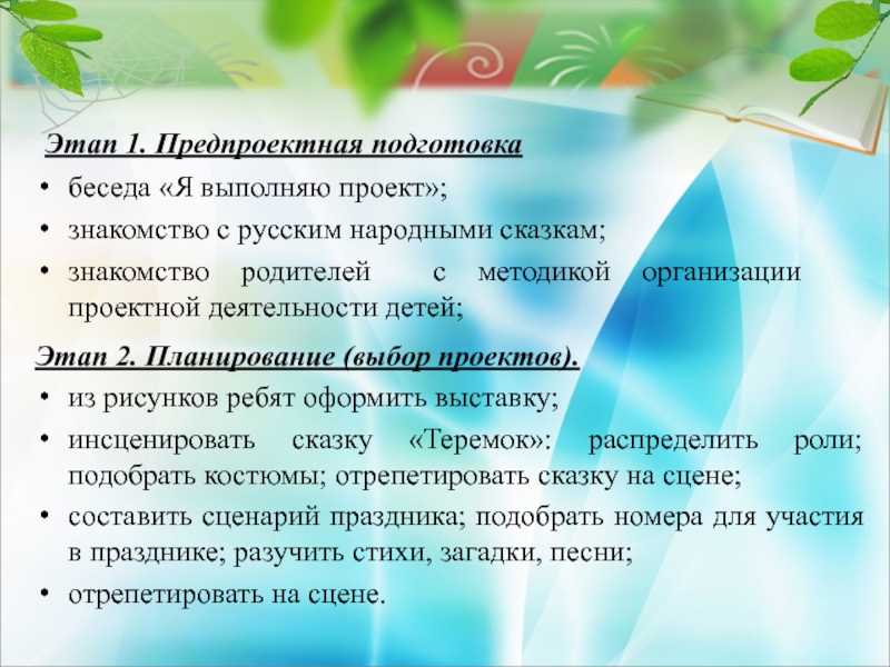 Выполнение проекта начинается с планирования действий по разрешению проблемы, иными словами – с проектирования самого проекта, в частности – с определения вида продукта и формы презентации.