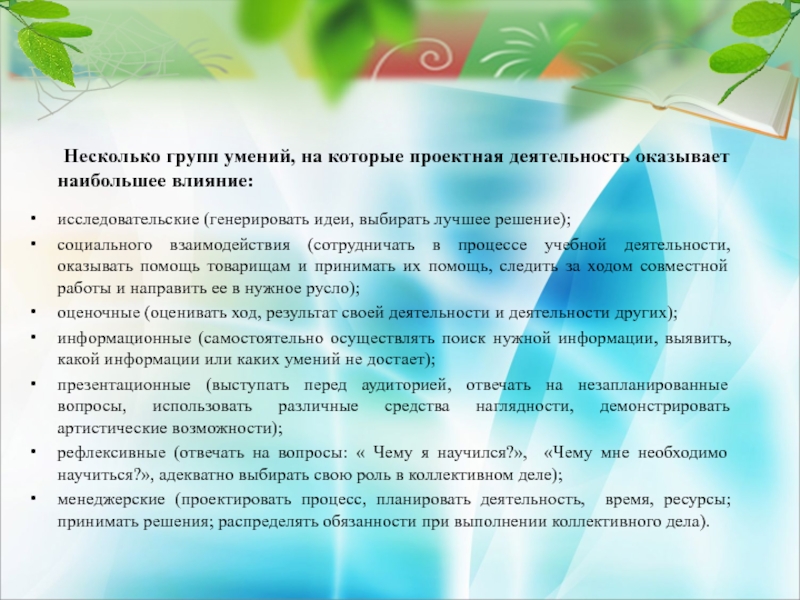 Слайд 25 Несколько групп умений, на которые проектная деятельность