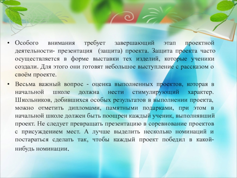 Весьма важный вопрос - оценка выполненных проектов, которая в начальной школе должна нести стимулирующий характер. Школьников, добившихся особых результатов в выполнении проекта, можно отметить дипломами, памятными подарками, при этом в начальной школе должен быть поощрен каждый ученик, выполнявший проект. Не следует превращать презентацию в соревнование проектов с присуждением мест. А лучше выделить несколько номинаций и постараться сделать так, чтобы каждый проект победил в какой-нибудь номинации.