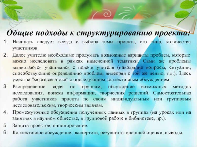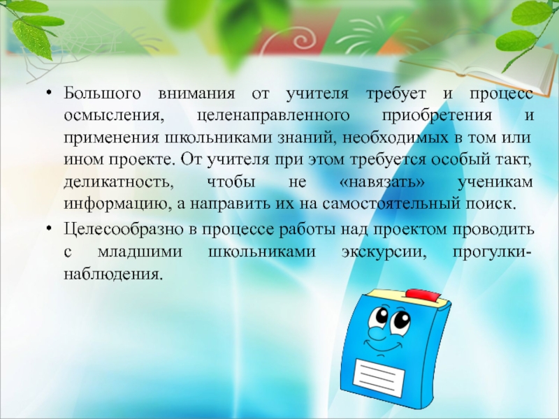 применения школьниками знаний, необходимых в том или ином проекте. От учителя при этом требуется особый такт, деликатность, чтобы не «навязать» ученикам информацию, а направить их на самостоятельный поиск.