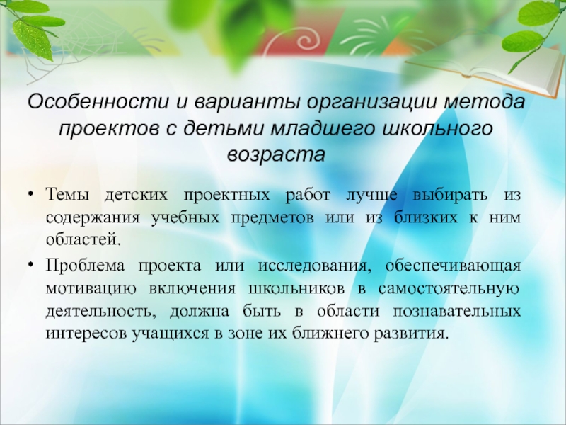 Слайд 26Особенности и варианты организации метода проектов с детьми младшего школьного возраста