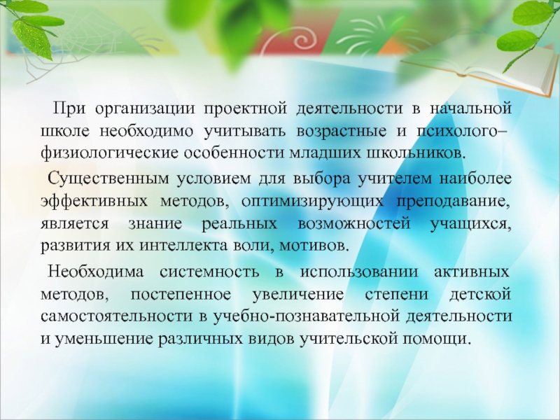 Слайд 29 При организации проектной деятельности в начальной школе необходимо учитывать