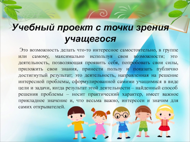 что-то интересное самостоятельно, в группе или самому, максимально используя свои возможности; это деятельность, позволяющая проявить себя, попробовать свои силы, приложить свои знания, принести пользу и показать публично достигнутый результат; это деятельность, направленная на решение интересной проблемы, сформулированной самими учащимися в виде цели и задачи, когда результат этой деятельности – найденный способ решения проблемы – носит практический характер, имеет важное прикладное значение и, что весьма важно, интересен и значим для самих открывателей.