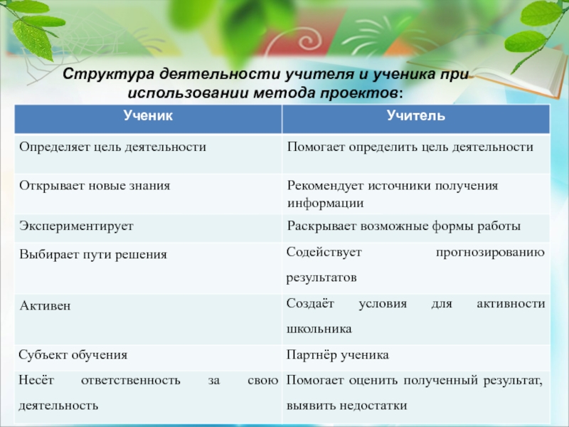 Слайд 24Структура деятельности учителя и ученика при использовании метода проектов: