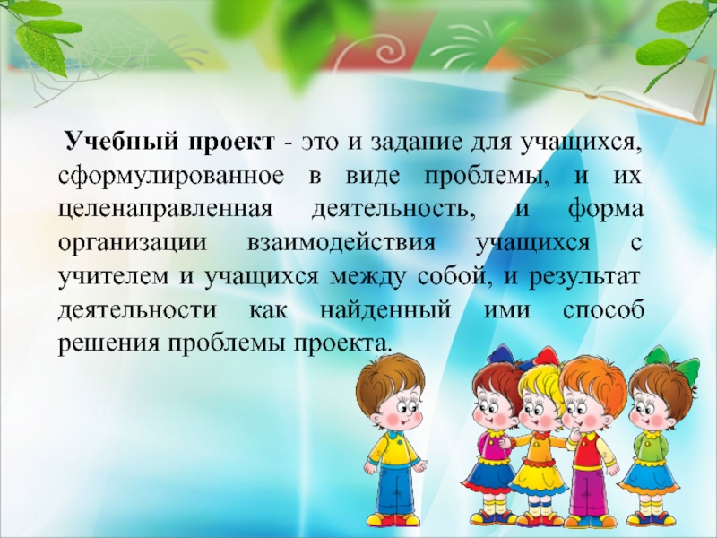 в виде проблемы, и их целенаправленная деятельность, и форма организации взаимодействия учащихся с учителем и учащихся между собой, и результат деятельности как найденный ими способ решения проблемы проекта.
