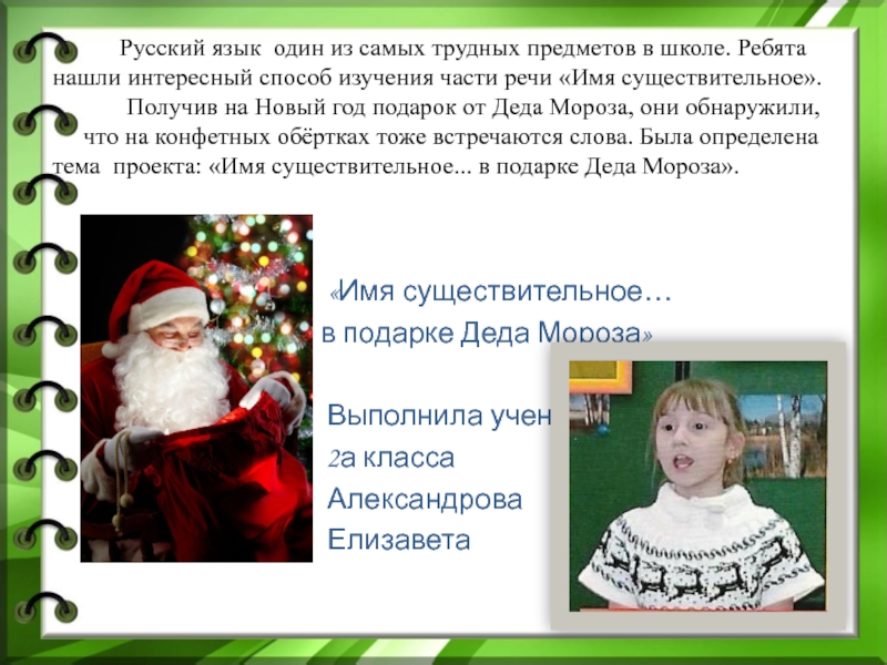 что на конфетных обёртках тоже встречаются слова. Была определена тема проекта: «Имя существительное... в подарке Деда Мороза».
