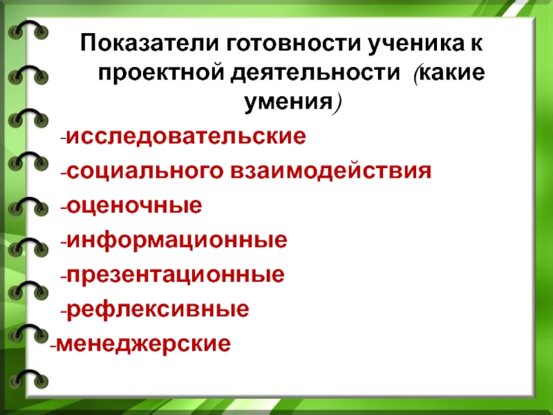 Показатели готовности ученика к проектной деятельности (какие умения)