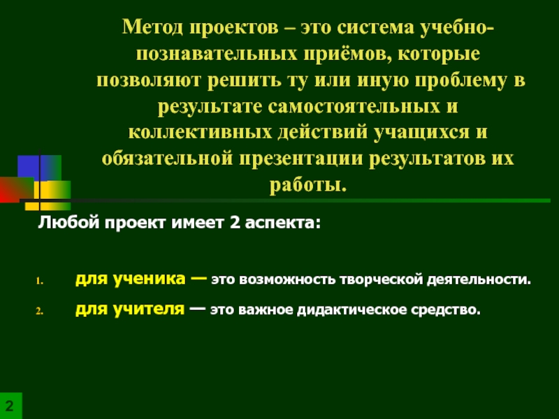 Метод проектов – это система учебно-познавательных приёмов, которые позволяют решить ту или иную проблему в результате самостоятельных и коллективных действий учащихся и обязательной презентации результатов их работы.