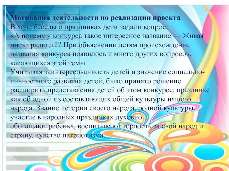 Учитывая заинтересованность детей и значение социально-личностного развития детей, было принято решение расширить представления детей об этом конкурсе, празднике как об одной из составляющих общей культуры нашего народа. Знание истории своего народа, родной культуры, участие в народных праздниках духовно