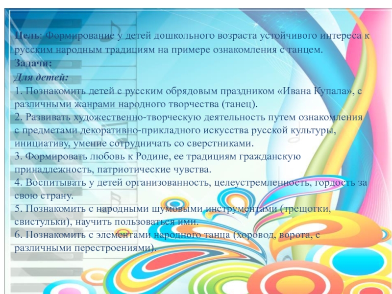 1. Познакомить детей с русским обрядовым праздником «Ивана Купала», с