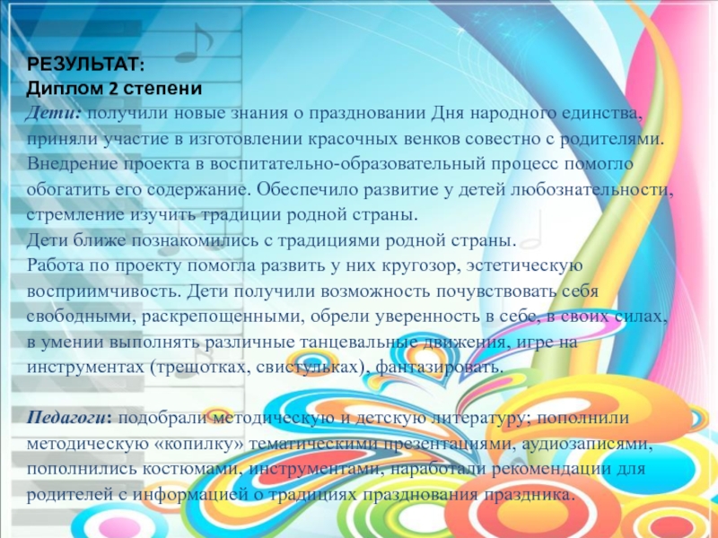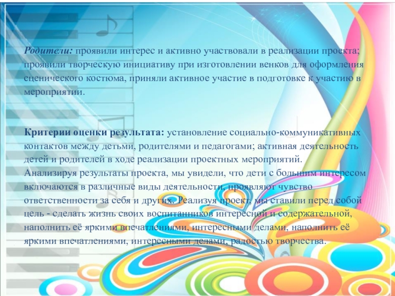 приняли участие в изготовлении красочных венков совестно с родителями. Внедрение проекта в воспитательно-образовательный процесс помогло обогатить его содержание. Обеспечило развитие у детей любознательности, стремление изучить традиции родной страны.