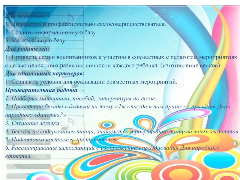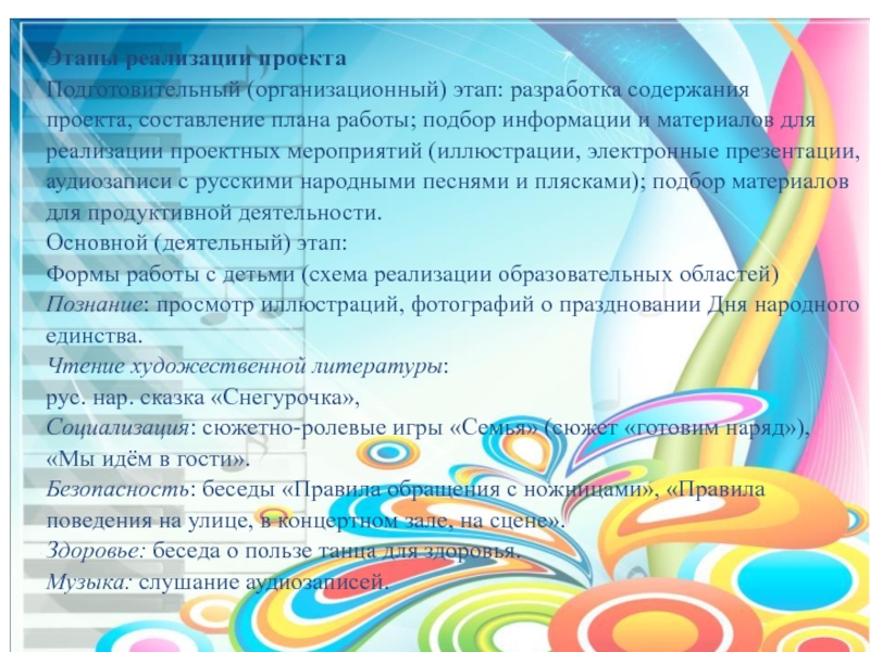 реализации проектных мероприятий (иллюстрации, электронные презентации, аудиозаписи с русскими народными песнями и плясками); подбор материалов для продуктивной деятельности.