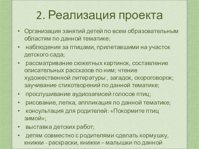 2. Реализация проектаОрганизация занятий детей по всем образовательным областям по данной тематике; наблюдения за птицами, прилетавшими на