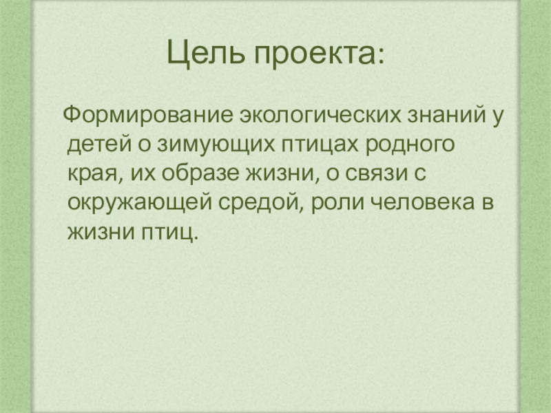 Цель проекта:  Формирование экологических знаний у детей о зимующих птицах родного края, их образе жизни, о