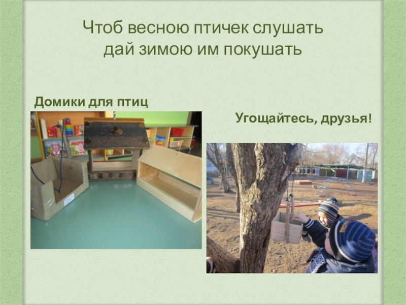 Чтоб весною птичек слушать  дай зимою им покушатьДомики для птиц Угощайтесь, друзья!